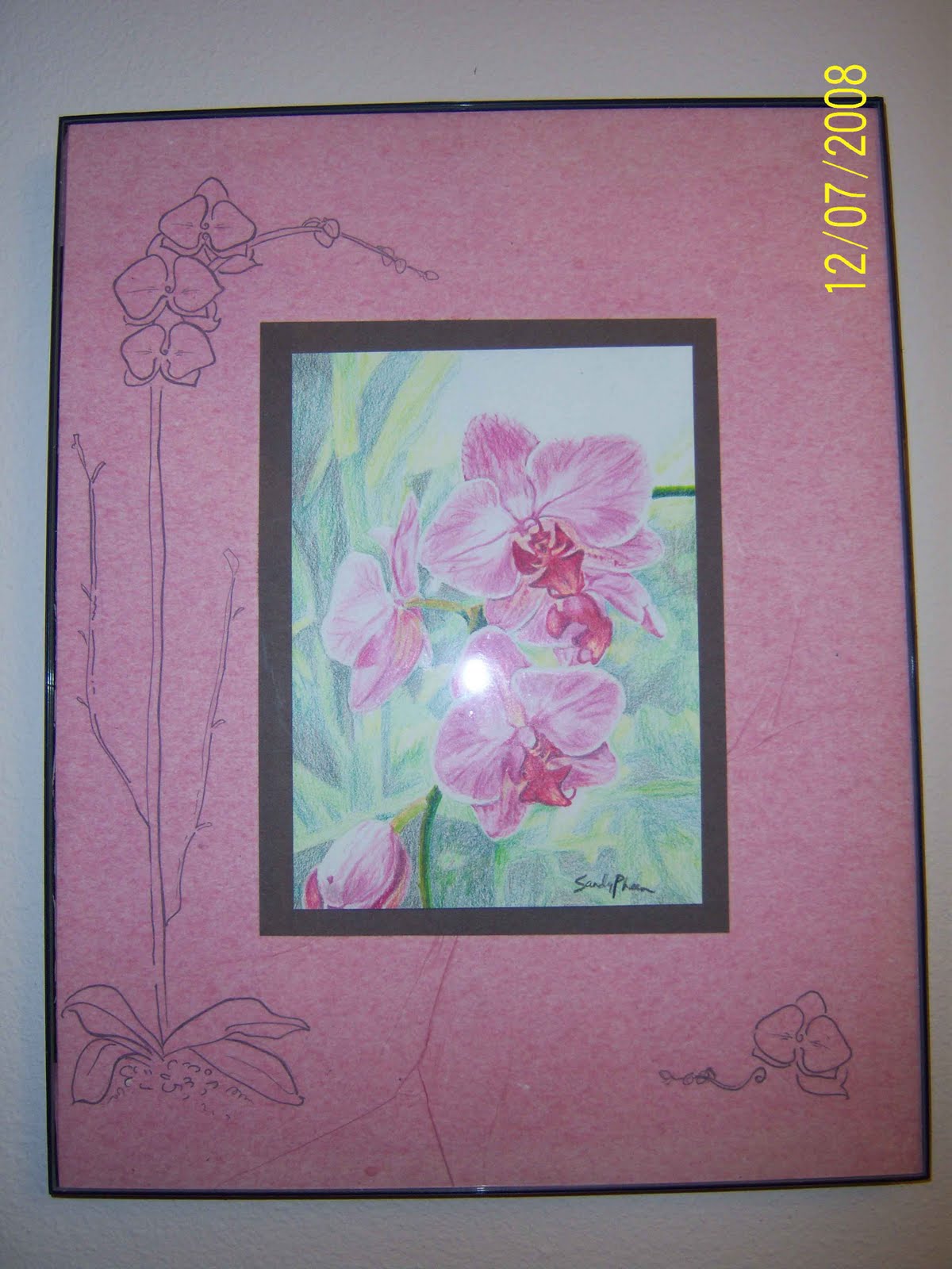| "Orchids," 2008. Colored pencil, collage, and pen & ink. A birthday gift for mom. |
